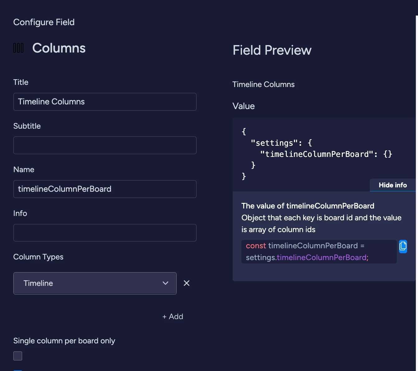 I want to be able of selecting also which subitem column, of type Timeline, I want to use.