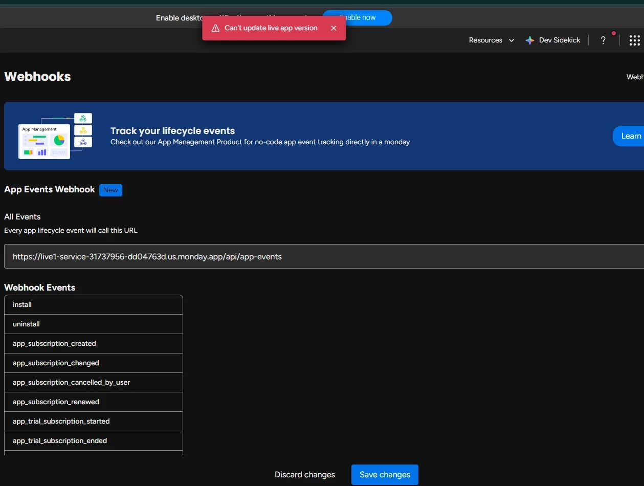We are experiencing an issue while configuring webhooks in the Developer Center. Specifically, we are unable to add our Live version URL; the system returns an error every time we attempt to save it but the version-specific URL is accepted without any issues.