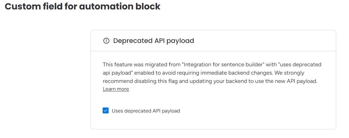 If I enable the “Use deprecated payload API” option, the integration still works as expected. However, once I disable this option, the integration starts failing.