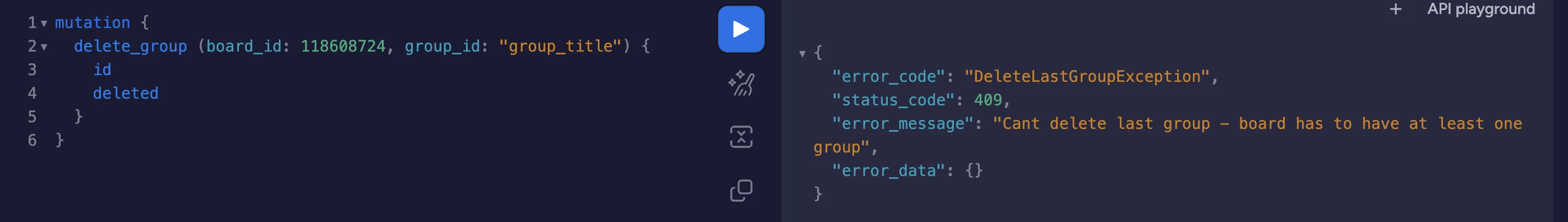 The new DeleteLastGroupException error occurs when you attempt to delete or archive the only group on a board. To resolve the error, ensure that the board has more than one group.
