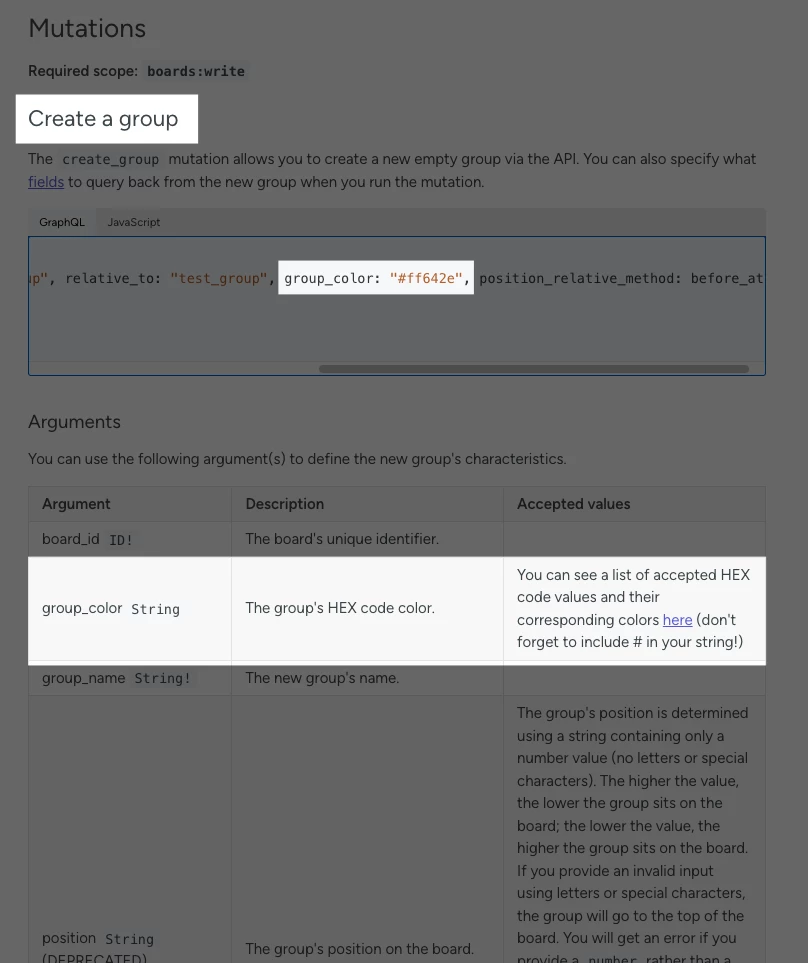 create_group (board_id: 1234567890, group_name: "new group", group_color: "#ff642e", relative_to: "test_group", position_relative_method: before_at) {