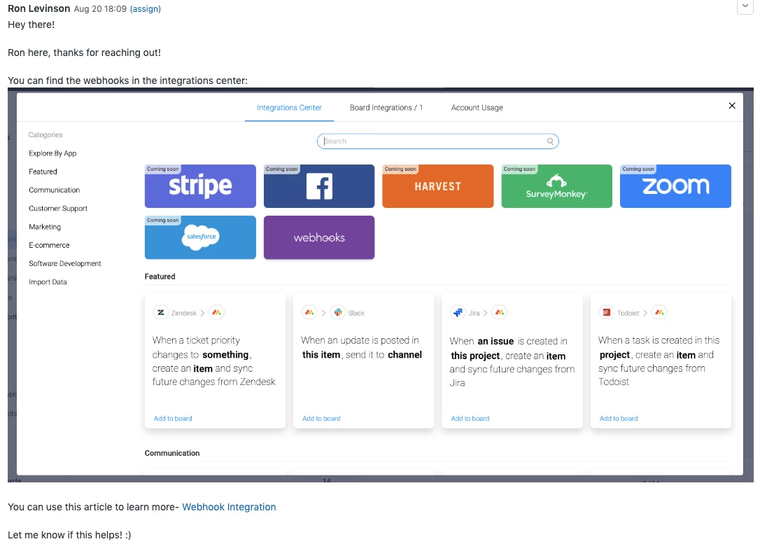 If you are interested in trying it out, email our support team at support@monday.com with the subject line monday.com Webhooks integration!